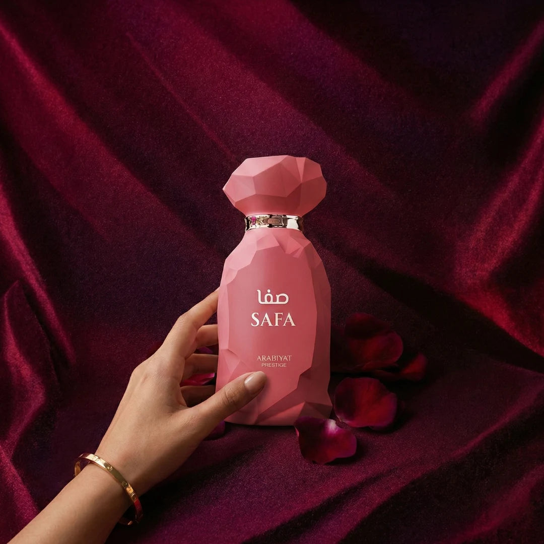 Safa by Arabiyat is a radiant floral fruity gourmand fragrance for women that blends brightness, elegance, and indulgent sweetness. It opens with a vibrant mix of lychee and red fruits, enriched by a soft nutty touch of hazelnut, creating a playful and inviting introduction that feels juicy, smooth, and delicately sweet.