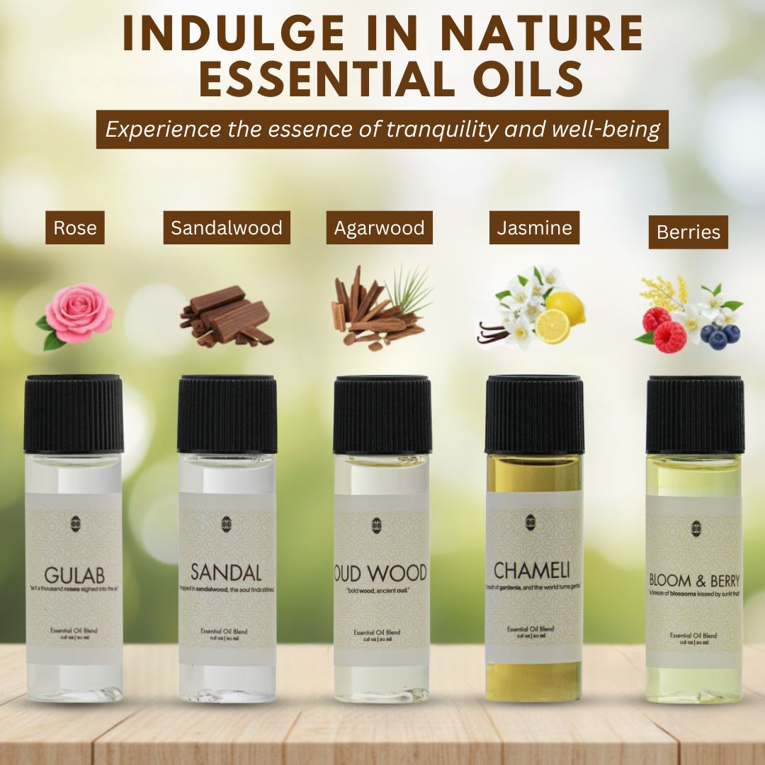 • GULAB: Fresh rose blended with soft musk and warm sandalwood, creating a romantic and soothing scent.