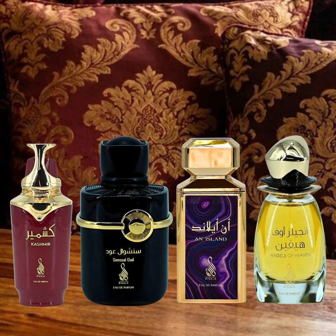 Kashmir, Sensual Oud, An Island & Angels of Heaven Eau de Parfum Sprays 100ml (3.4 oz) by Risala(Bundle)
