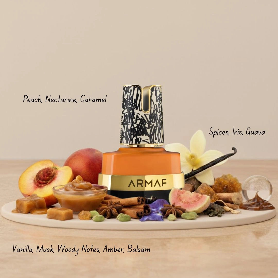 At the heart, spices, iris, and guava blend beautifully to create a unique, contemporary character. The scent settles into a comforting base of vanilla, musk, woody notes, amber, and balsam, leaving a lasting impression that’s both inviting and sophisticated.