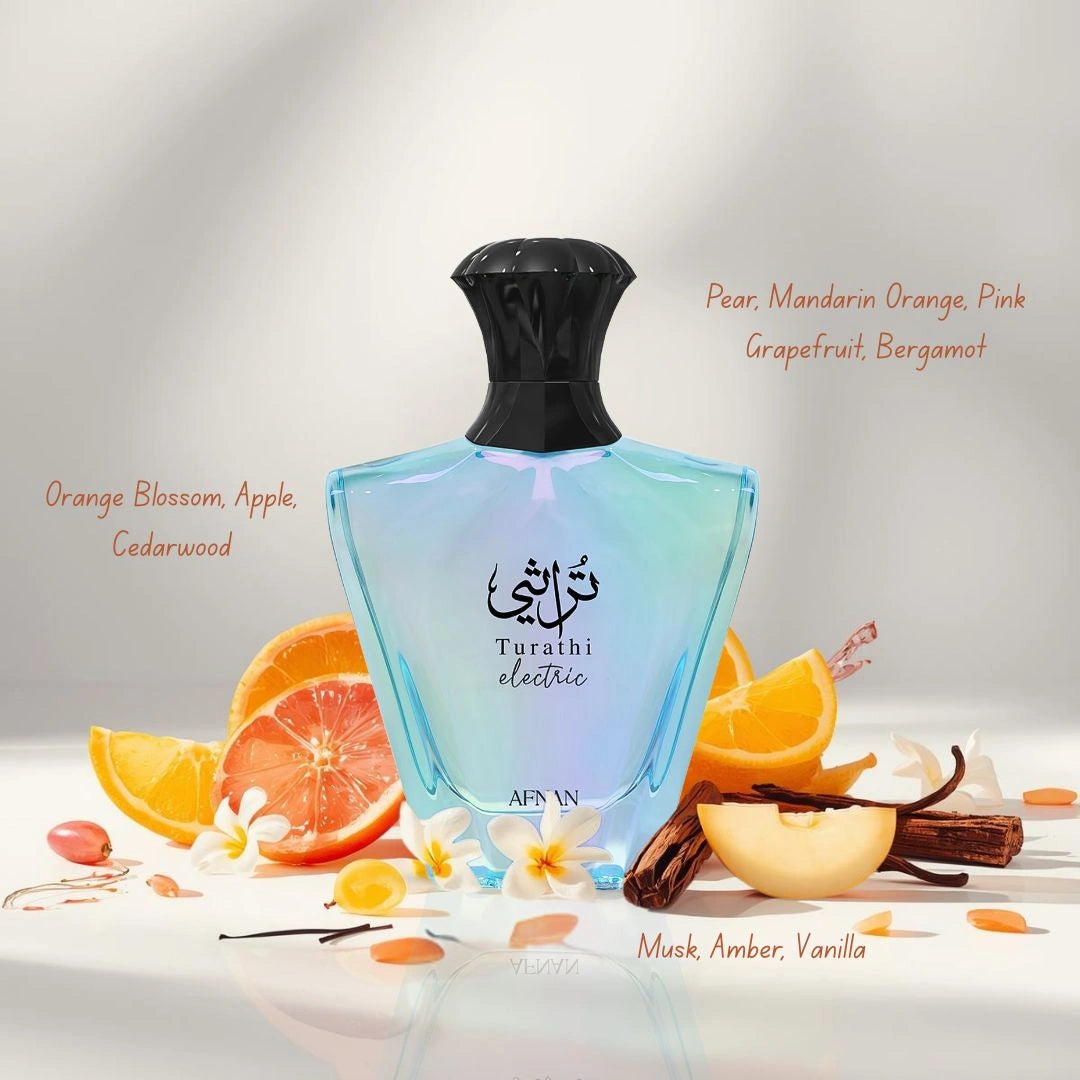 Turathi Electric by Afnan is a lively floral fruity fragrance that radiates vibrance and energy. It opens with a sparkling fusion of pear, mandarin orange, pink grapefruit, and bergamot—bright, juicy, and irresistibly fresh. The heart reveals a smooth blend of orange blossom, crisp apple, and soft cedarwood, adding both sweetness and depth. Finally, the base settles into a warm and sensual combination of musk, amber, and vanilla, leaving a creamy, luminous trail that feels both modern and captivating.
